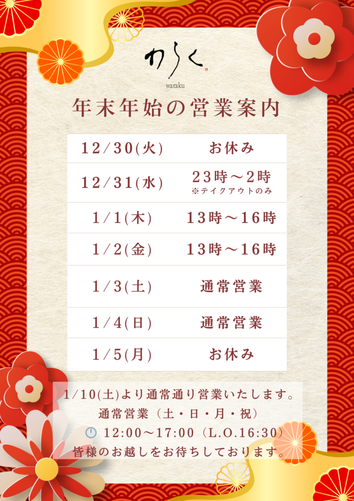 年末年始は、通常と営業時間・営業形態が異なる日がございます。